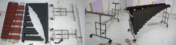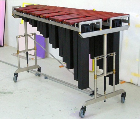 Die Klangstäbe sind aus Padouk gefertigt, c - c```(3 Okt.) auf a`443 gestimmt und in Rahmen montiert. Das Instrument ist rasterlos höhenverstellbar, gebaut aus 8 Teilen, die in geeignete Taschen verpackt werden können. Der Unterbau ist aus rostfreiem Stahl, die Resonatoren sind aus Holz gebaut.